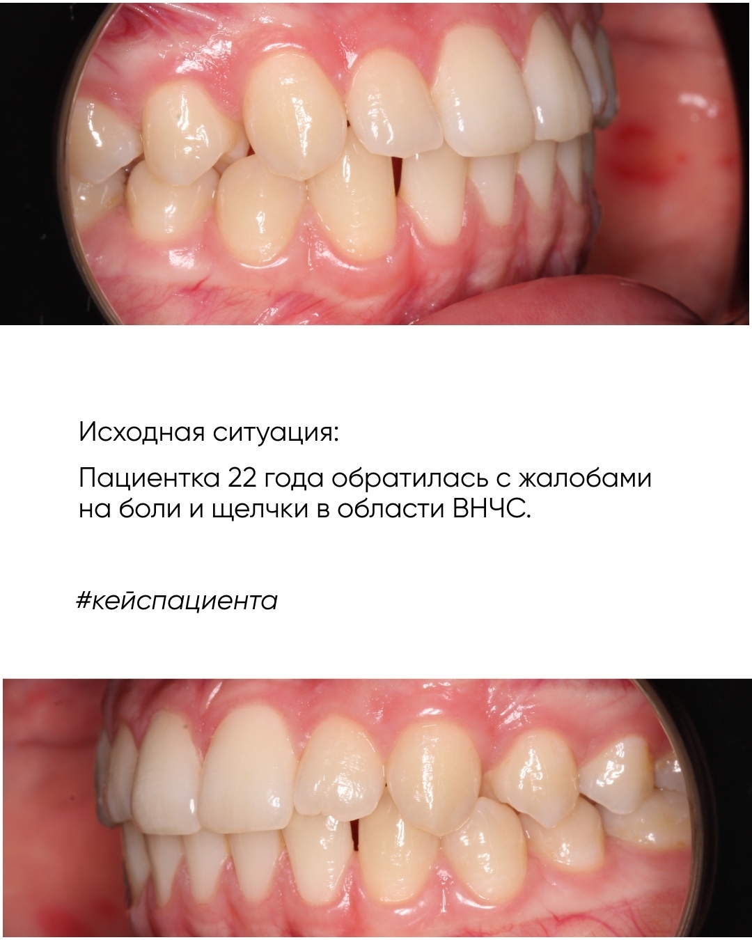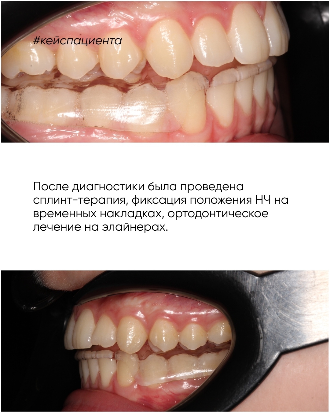 После диагностики была проведена сплинт-терапия, сплинты изготовлены в лаборатории S-Line Lab, фиксация положения нижней челюсти на временных накладках, ортодонтическое лечение на элайнерах S-Line.