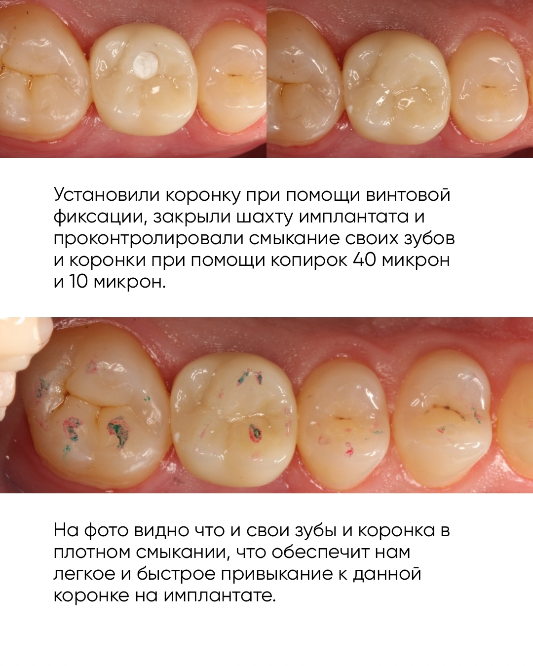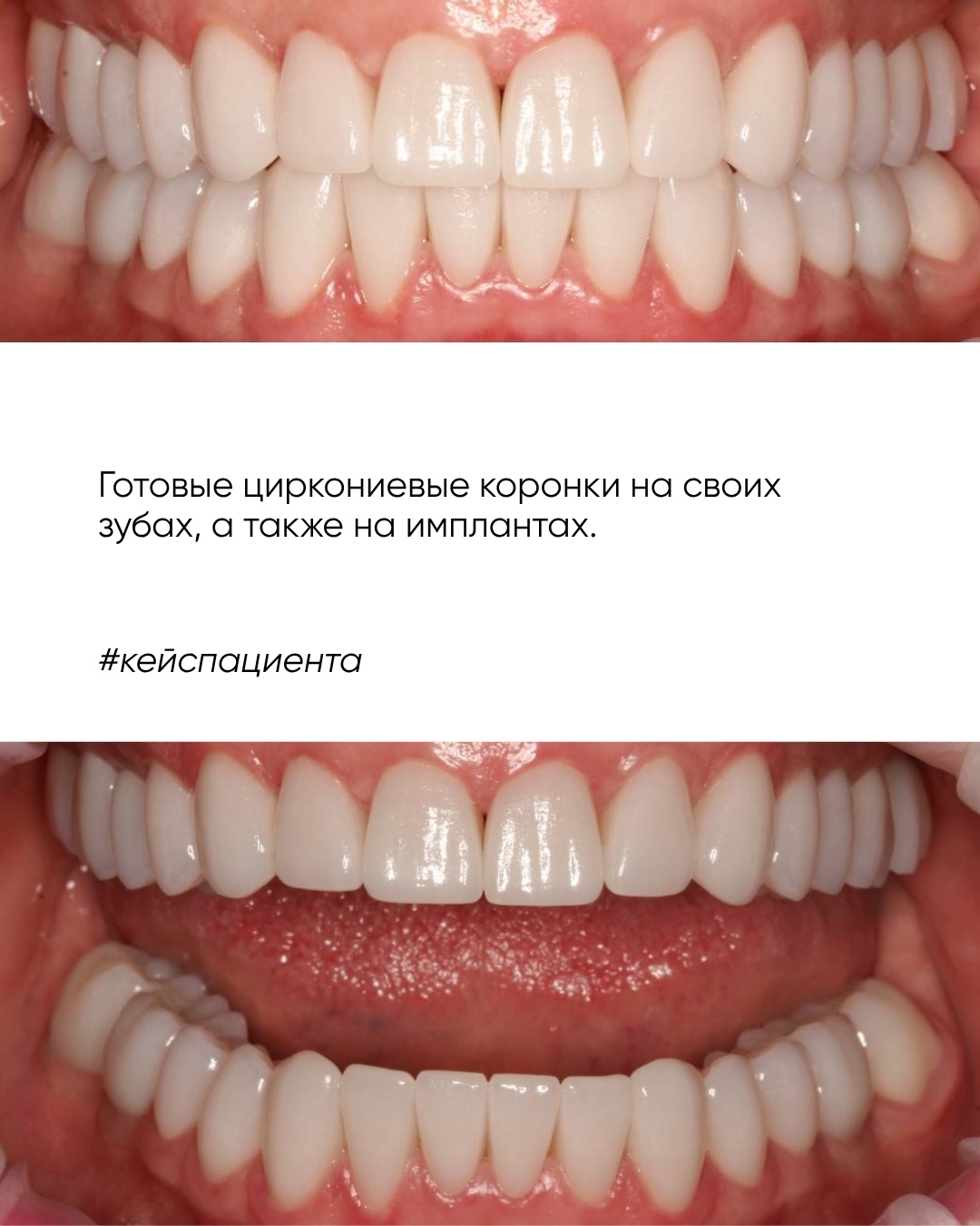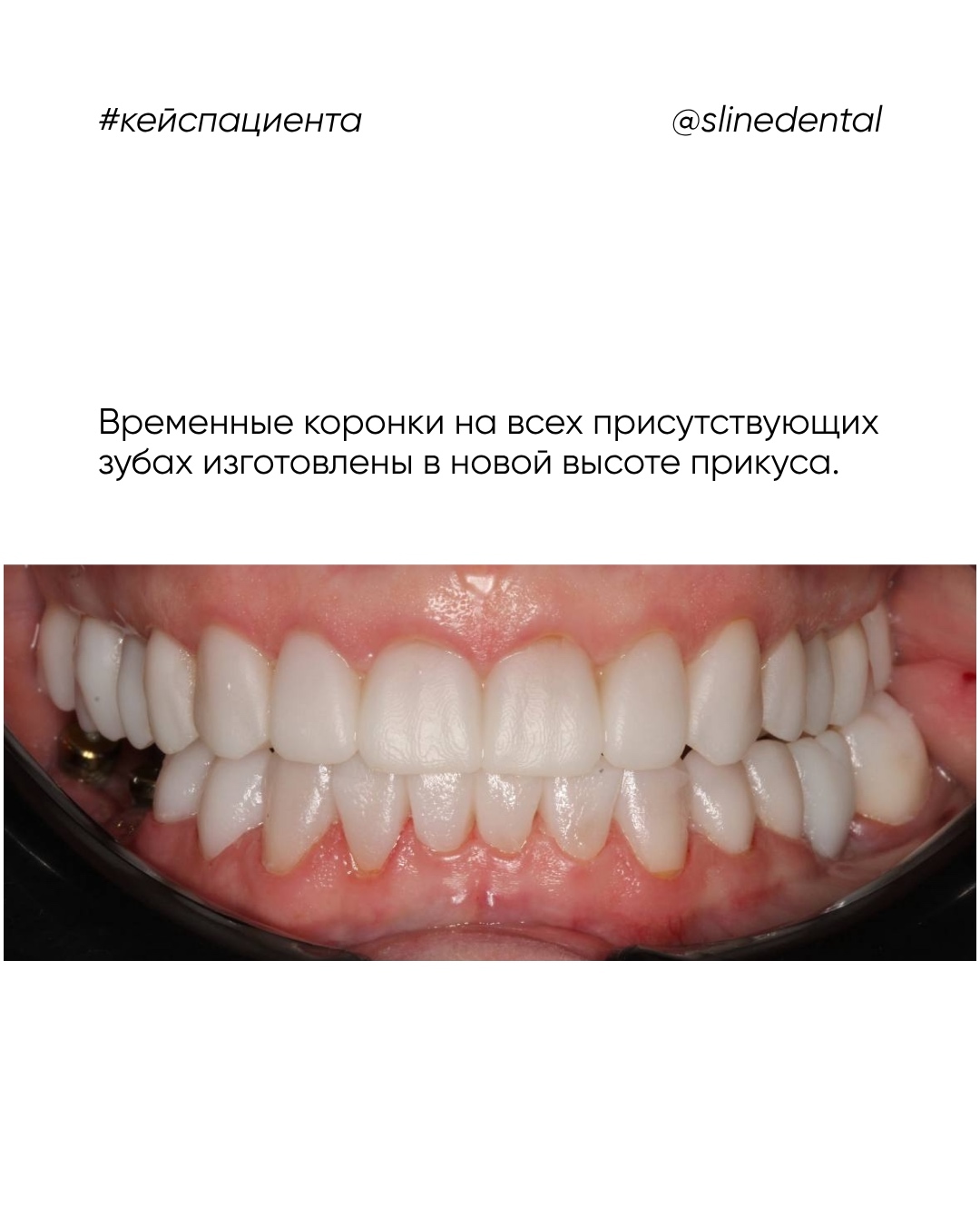 Этапы работы: 1. Изготовлены временные коронки на все присутствующие зубы — в новой, физиологически правильной высоте прикуса. 2. После адаптации пациента установлены циркониевые коронки — как на собственные зубы, так и на импланты.