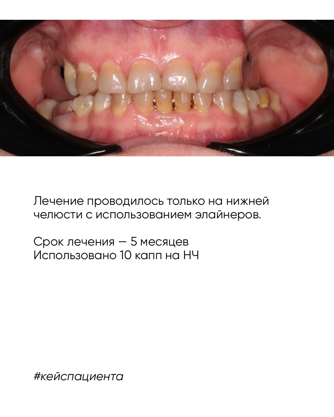 Лечение проводилось только на нижней челюсти с использованием элайнеров. Срок лечения — 5 месяцев Использовано 10 капп на НЧ